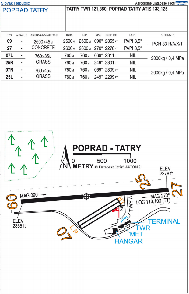 Airport Data: International, Poprad 5km (3miles), Position 49°04´25"N, 020°14´28"E, Elevation 718m (2 355ft), Operating hours Mon-Fri 07:15-22:00 Sat-Sun 07:15-1900, 1 Passenger Terminal, 4 Aircraft Stands.